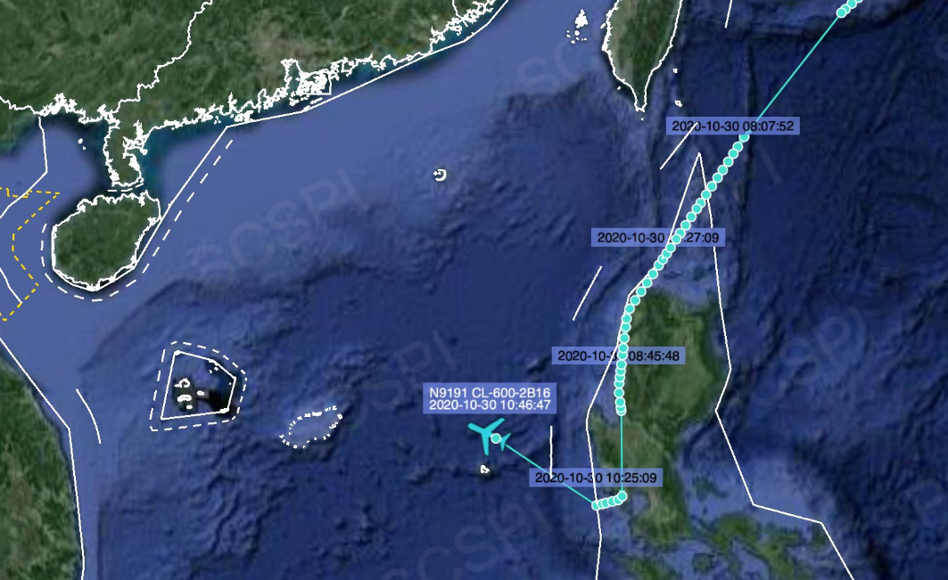 飛行軌跡顯示美國陸軍的CL-604偵察機經停菲律賓後進入南海