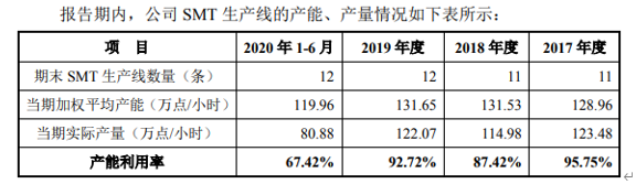 但另一方面,招股書第227頁披露的“報告期內,公司SMT生產線的產能、產量情況”顯示,公司並不存在產能瓶頸,相反今年上半年的產能利用率僅為三分之二;該公司在回覆中也表示“公司2020年上半年的訂單交付進度有所推遲,因此公司產能利用率有所下降”。這令人質疑,該公司在招股書中披露的“將有效緩解公司的產能瓶頸”,存在信息披露誤導。