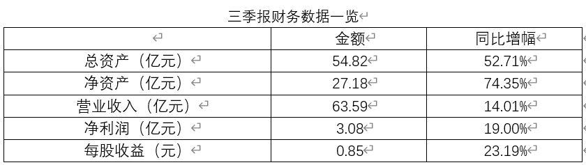 2020年前三季度,公司實現營業收入約63.59億元,同比增長14.01%;淨利潤約3.08億元,同比增長19%;基本每股收益0.85元,同比增長23.19%。公司擬向全體股東每股派發現金股利0.125元(含税)。