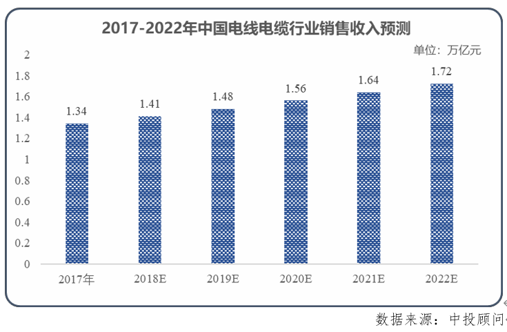 我國電線電纜行業經歷了長期快速發展後,隨着市場規模基數的不斷增長,未來行業增速將有所下降,但仍將保持良好的增長態勢。2017年中國電線電纜行業銷售收入為1.34萬億元。根據中投顧問產業研究中心出具的報告,2022年中國電線電纜行業銷售收入將達到 1.72萬億元,複合增長率達5.12%。根據 Market Research Reports 預測,到2020 年中國電線電纜產能有望突破1.1億千米,產值突破1.6萬億元。