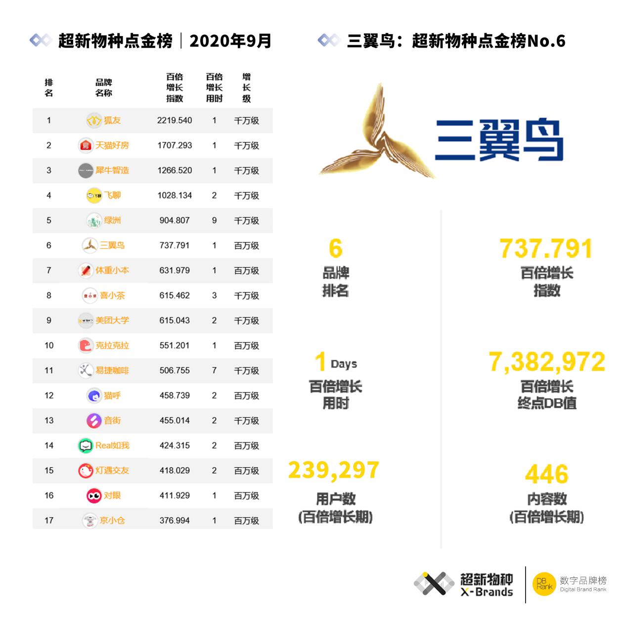 根據超新物種X-Brands榜的分析結果顯示,三翼鳥僅用了一天的時間,就實現了心智資本的百倍增長,緊隨狐友、天貓好房、犀牛智造、飛聊、綠洲之後,以737791的百倍增長指數排名第六。