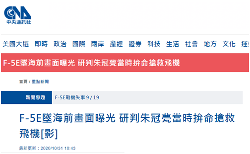 【環球網報道 記者 尹豔輝】台空軍第七聯隊志航基地F-5E戰機10月29日失事墜海,飛行員朱冠甍遇難。據台灣“中央社”、《聯合報》等台媒報道,台軍方持續進行失事調查的同時,今天(31日)有民眾提供監控器拍到的戰機失事前的視頻,整個過程僅短短7秒鐘,似乎飛行員試圖努力控制飛機。