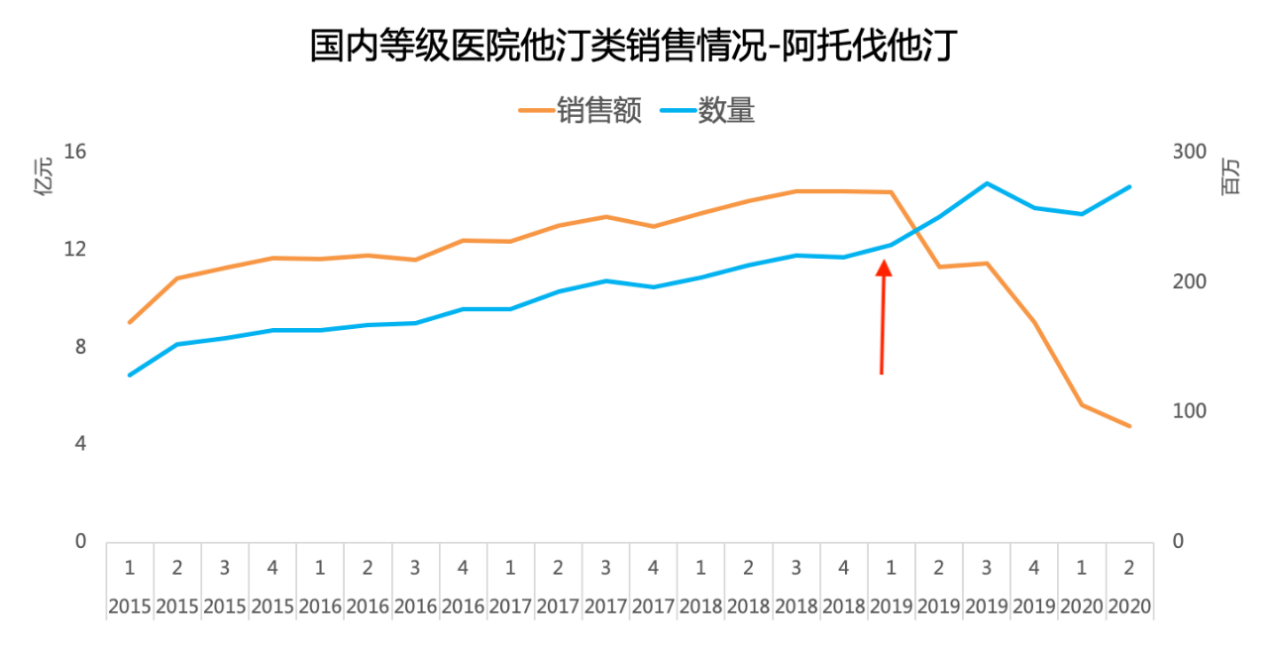 2019年“4+7”帶量採購全面擴圍後,降血脂藥物行業也在發生一些新的變化。市場銷售方面,數據顯示阿託伐他汀在國內等級醫院的銷售數量繼續保持穩定增長,但由於集中採購導致產品價格大幅降低,銷售額出現了“斷崖式”下跌,2020年二季度的銷售額已不足2018年4季度的1/3。銷售渠道方面,醫院採購渠道和非醫院的OTC渠道也出現了明顯的分化。由於醫院集採渠道的價格過低,藥企大多開始向零售藥店等終端渠道進行了不同程度的側重。