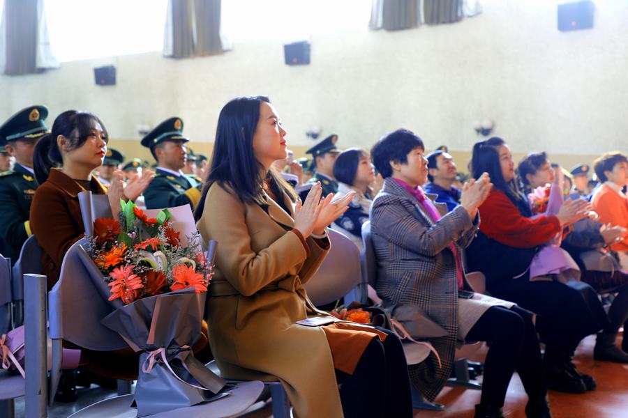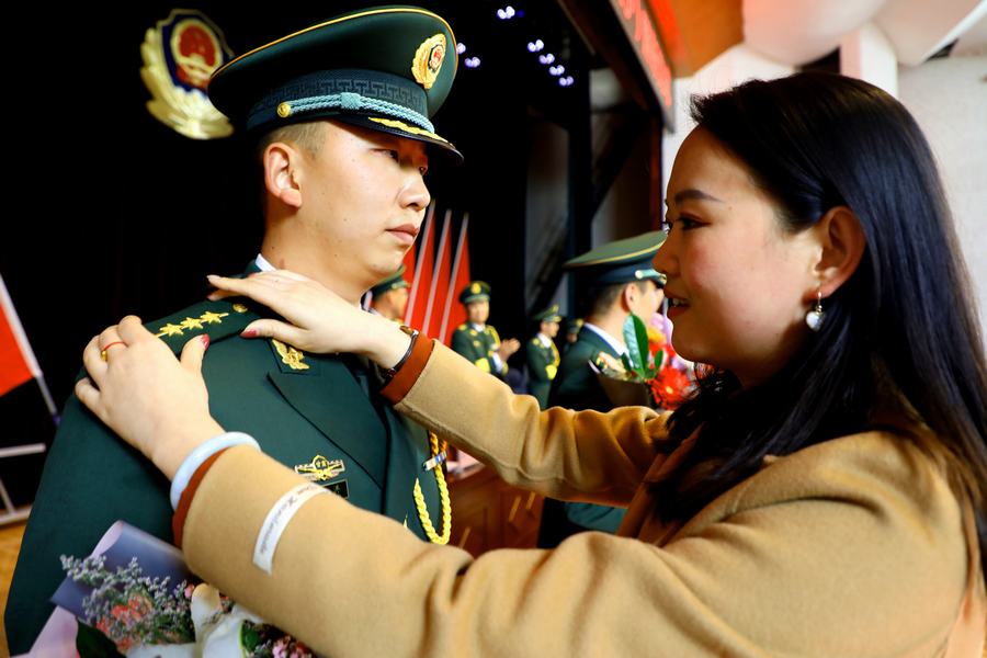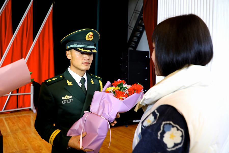 軍功章上有我的一半,也有你的一半。家屬懷抱鮮花走上主席台,親自為親人更換新警銜,“能夠參加老公的警銜晉升儀式,我很自豪,幸福感爆棚!”工兵中隊中隊長吳凌霄的愛人韓玉敏激動地所道。