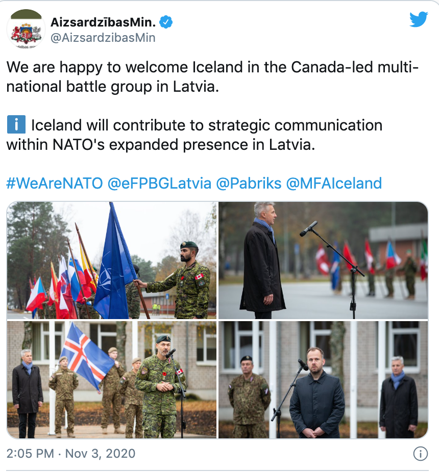 拉脱維亞國防部的官方社交媒體上發佈了消息:我們很高興歡迎冰島參加由加拿大領導的拉脱維亞北約戰隊。