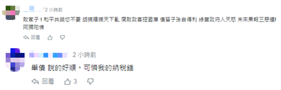 對此,有島內網友在台媒評論區留言稱,“舉債説的好順,可憐我的納税錢”;也有網民批評稱,“和平共榮您不要,胡搞瞎搞天下亂,腐敗政客挖公庫,債留子孫自得利,綠營政府人天怒,未來果報三惡道!”
