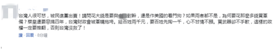 還有網友説,“台灣人很可悲,被民進黨出賣!請問花大錢是要與大陸對幹,還是作美國的看門狗?如果兩者都不是,為何要花那麼多錢買軍備?蔡英文還要惡搞四年,台灣財政會被軍購拖垮。給百姓兩千元,要百姓先掏一千,心不甘情不願。買武器卻不手軟,這樣的政權一定要推翻,否則台灣沒救了!”↓