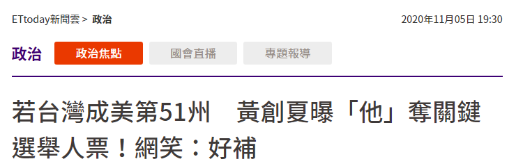 台灣“ETtoday新聞雲”:若台灣成“第51州”,黃創夏曝“他”奪關鍵選舉人票