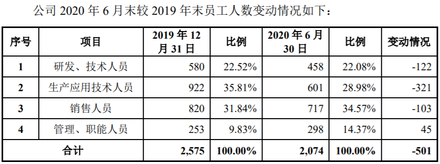 另據招股書披露,2020年上半年末公司的員工總數為2074人,相比2019年末的2575人減少了將近五百人,也即公司在今年上半年的綜合裁員比例高達20%左右。招股書第83頁也提到:2020年1至6月,公司新招聘員工122人,離職員工623人,其中主動離職員工390人,因公司人員結構優化且不接受內部調崗的安排而辭退的員工233人。主動離職員工人數如此多,對於一家擬上市公司而言非常少見。
