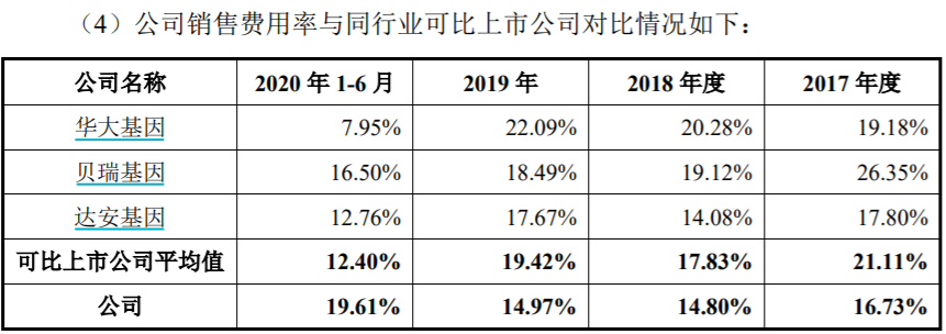 但另一方面,數據顯示諾禾致源在今年上半年的營業收入同比還微增了2.64%、並未出現“業務規模減少、收入下降”,相反營業額同比下滑7.37%的貝瑞基因,銷售費用率也是下降的。這也就意味着,招股書中針對銷售費用率大幅增長的原因解釋並不合理,存在信息披露誤導之嫌。