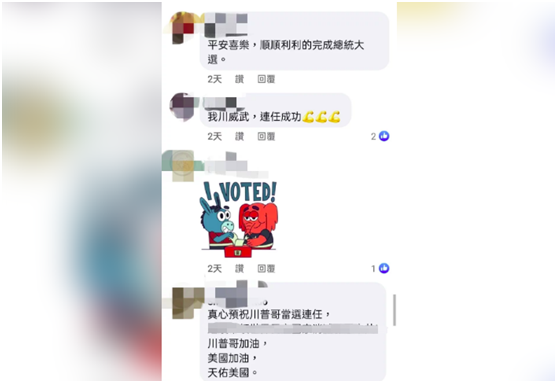 台灣民眾普遍關注本次美國總統大選結果,台灣外事部門呼籲民眾務必理性、冷靜看待美國的民主選舉,並對“台美”關係保持信心,勿對特定粉絲專頁進行非理性留言攻擊,也勿被相關錯誤訊息所誤導云云。