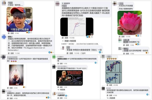 據台灣“聯合新聞網”“自由時報”報道,台灣民眾關注美國總統選舉,美國在台協會(AIT)臉書近日貼文下方出現大量網軍留言,批評民主黨作票(利用不正當手段,為特定候選人增加得票數的行為)、支持特朗普告到底等。有網友留言“拜登是個笑話”,也有網友選取媒體報道質疑“拜登的選舉是用騙的嗎?”