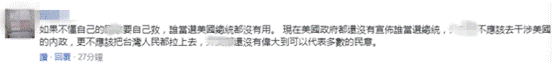 也有網民認為,“如果不懂自己的‘國家’要自己救,誰當選美國總統都沒有用。現在美國政府都還沒有宣佈誰當選總統,‘外交部’不應該去幹涉美國的內政,更不應該把台灣人民都拉上去,‘外交部’還沒有偉大到可以代表多數的民意。”