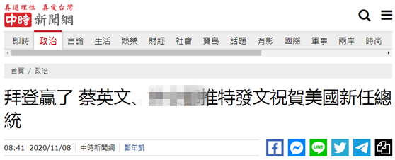 【環球網報道 記者 尹豔輝】美國總統大選戰況膠着多日,11月8日凌晨多家美媒報道,在2020年美國大選中,民主黨總統候選人拜登已經獲得當選所需的270張選舉人票。台灣中時新聞網、三立新聞網等媒體報道稱,8日早上,台當局領導人蔡英文以及外事部門都在推特上推文祝賀。對此,有島內網民説,“真是髮夾彎專業户”。