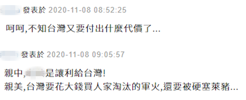 此外,也有網友表示,“不知台灣又要付出什麼代價了…”“親陸,大陸是讓利給台灣!親美,台灣要花大錢買人家淘汰的軍火,還要被硬塞萊豬…”