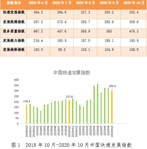 據測算,2020年10月中國快遞發展指數為302.4,同比提高38.9%。發展規模指數、服務質量指數、發展能力指數和發展趨勢指數分別為309.6、476.3、185.9和108.9,比上年同期分別提高32.6%、60.1%、8.8%和53.5%,表明我國快遞市場在發展規模、服務質量和發展趨勢方面提升明顯,發展能力穩中有進。
