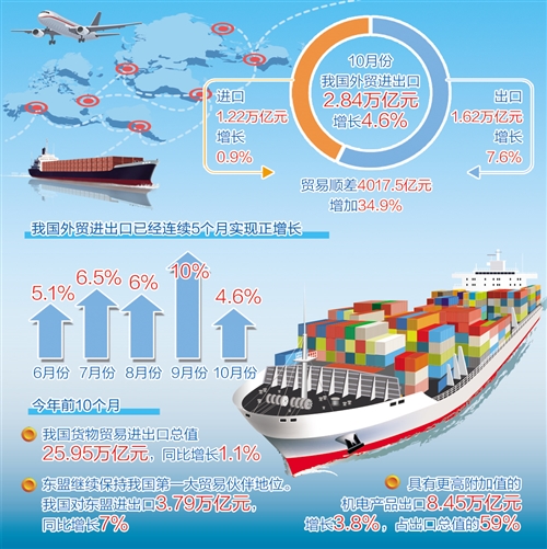 從主要貿易伙伴看,東盟繼續保持我國第一大貿易伙伴地位。前10個月,我國對東盟進出口3.79萬億元,同比增長7%,佔我國外貿總值的14.6%。同時,我國對歐盟、美國和日本等貿易伙伴進出口也實現了增長。