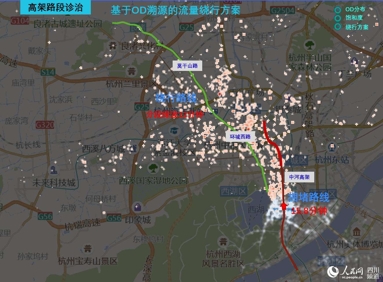 如果採用智慧誘導方式,引導目的地為西湖大道入口的用户繞行至地面莫干山路,便能使到達目的地的區域車流量更加均衡,再通過動態調控紅綠燈配時加快該路段車輛通行效率,預計該高架道路匝道擁堵程度可下降20%。