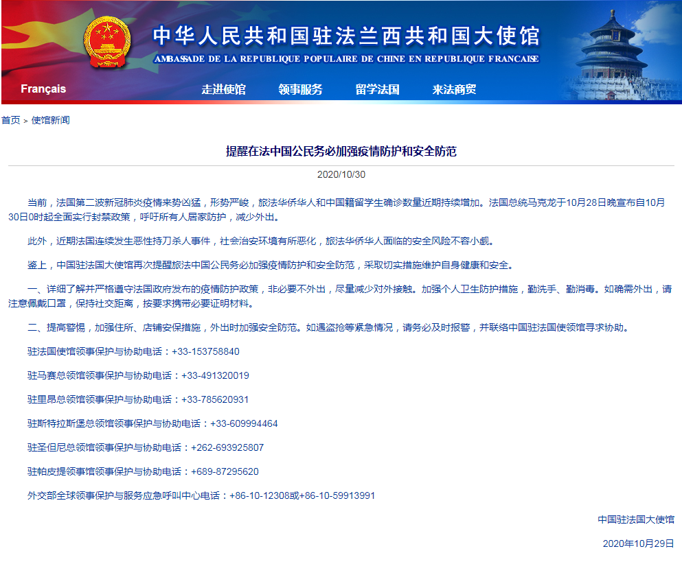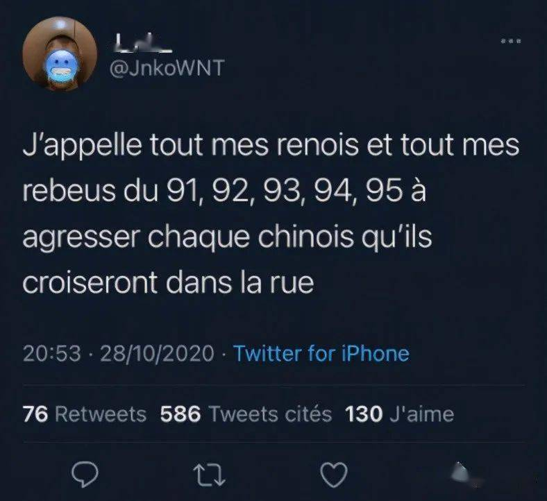 值得警惕的是,相關案件呈現出越來越多針對亞裔甚至華人的苗頭。10月底,法國社交媒體出現“中國人傳播病毒”的污名化帖文,公然號召“襲擊在街上遇見的每個中國人”。很難相信,一向與人為善、“温良恭儉讓”的中國同胞會在海外成為暴徒的襲擊目標。