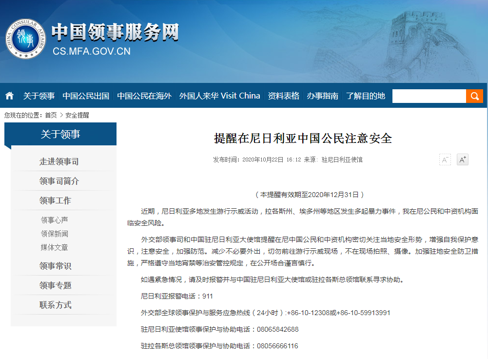 廣大海外同胞作為自身安全的第一責任人,也需高度重視所在國家及地區的治安形勢和突發事件。應注意加強安全防範,提高警惕,儘量避免前往混亂區域,“非必要不外出”,避免隨身攜帶或居家存放大量現金。當遇到正在發生的惡性治安事件,切勿過度好奇,停留圍觀,以免造成不必要的傷害。同時,請千萬牢記所在地區的警方及中國駐外使領館的聯繫方式。如遇緊急情況立即報警,同時聯繫使領館尋求協助。