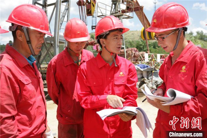 楊義興(右二)和工友探討修井方案。(資料圖)受訪者供圖