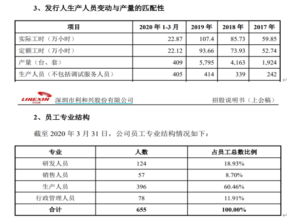 另據招股書披露的“生產人員變動與產量的匹配性”信息顯示,利和興在今年一季度的實際工時為22.87萬小時,對應產品產量為409台,折算每台產品對應的實際工時為559.17小時;而在2019年,利和興的實際工時為107.4萬小時,對應產品產量為5795台,折算每台產品對應的實際工時僅為185.33小時,僅相當於今年一季度的三分之一左右。