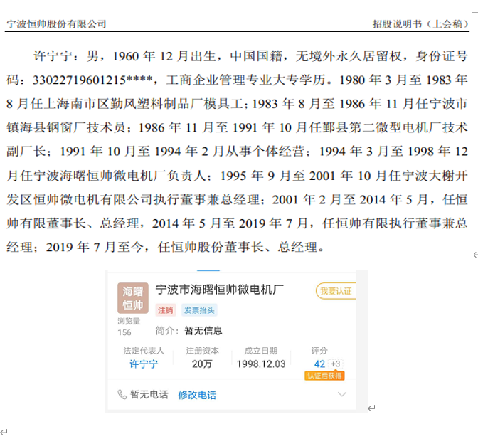 此外,根據招股書披露的實控人的職業履歷,許寧寧先生在1994年3月至1998年12月任“寧波海曙恆帥微電機廠”負責人。但是《全國企業信用信息公示系統》查詢顯示,並未有名稱為“寧波海曙恆帥微電機廠”的企業註冊,據《天眼查》查詢顯示,“寧波市海曙恆帥微電機廠”註冊成立於1998年12月,這與招股書披露的許寧寧在1994年3月至1998年12月任“寧波海曙恆帥微電機廠”負責人信息也存在矛盾。