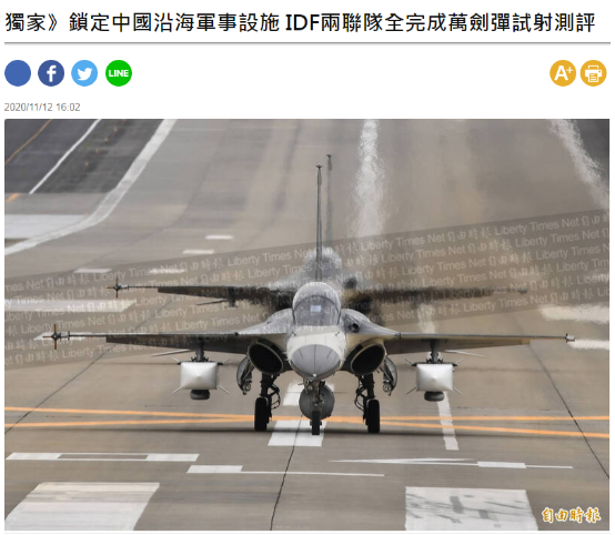 據台灣親綠媒體“自由時報”11月12日報道,台灣“空軍”第1聯隊的1架“經國號”IDF戰鬥機在11月11日進行了“萬劍彈”(視距外集束彈藥巡航導彈)的試射。報道還宣稱,目前裝備IDF戰鬥機的第1、第3聯隊都已經具備攻擊大陸沿海重要軍事設施的能力。