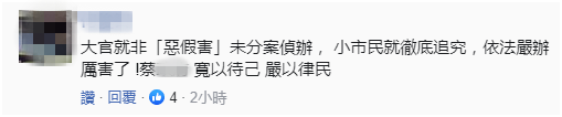 還有網友稱,“大官就非‘惡假害’未分案偵辦,小市民就徹底追究,依法嚴辦,厲害了!蔡政府寬以待己,嚴以律民。”