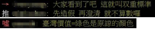 中時新聞網注意到,還有網民在島內網絡論壇PTT留言稱,“大家看到了吧,這就叫雙重標準。”“先造假、再澄清,就不算數囉。”“台灣價值=綠色是原諒的顏色。”