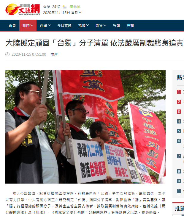 《大公報》報道,記者從權威渠道獲悉,針對島內外“台獨”勢力活動猖獗、氣焰囂張,為予以有力打擊,中央有關方面正在研究制定“台獨”頑固分子清單,對那些涉“獨”言論囂張、謀“獨”行徑惡劣的頑固分子,及其金主等主要支持者,採取嚴厲制裁等有效措施,包括依據《反分裂國家法》及《刑法》、《國家安全法》有關“分裂國家罪”等條款繩之以法,終身追責。