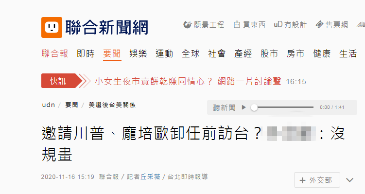 報道援引台外事部門發言人歐江安的話稱,有關邀請美國總統特朗普、國務卿蓬佩奧卸任前訪台或美國軍艦靠港等假設性議題,該部門目前並沒有相關規劃,也未曾與美方就這些事項進行討論。