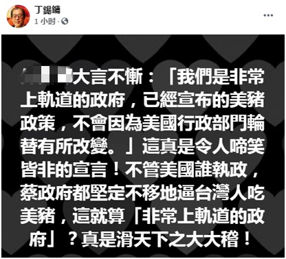 針對這番説辭,2010台北國際花卉博覽會總製作人丁錫鏞在臉書上發文稱,“這真是令人啼笑皆非的宣言!不管美國誰執政,蔡‘政府’都堅定不移地逼台灣人吃美豬,這就算‘非常上軌道的政府’?真是滑天下之大大稽!”