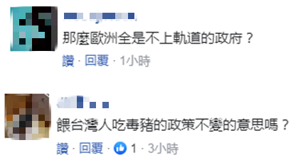 在台媒評論區,也有網友留言質疑,“那麼歐洲全是不上軌道的政府?”“喂台灣人吃毒豬的政策不變的意思嗎?”