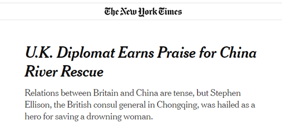 在這篇題為“英國外交官因在中國下河救人而獲讚揚”的報道中,《紐約時報》記者在前幾段介紹了事件的經過,並提到雖然中英兩國關係最近有些緊張和摩擦,但這名英國外交官的行為卻贏得了中國網民的稱讚。