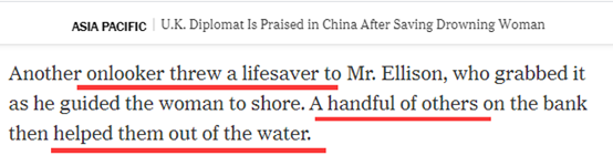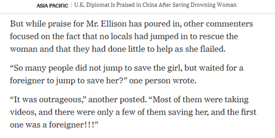 然而,這一對中國社會的負面描述,卻和《紐約時報》開頭幾段報道的英國外交官搭救落水女子的情節產生了矛盾。因為該報明確提到了當時旁觀者中有人在呼救,有人還找來了木棍和救生圈,還有一羣人把他和落水女子拉了上來。
