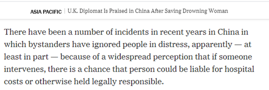 可遺憾的是,該報記者並沒有從這麼一個客觀的角度去看問題,而是奇怪地開始抨擊起中國人“冷漠”來,稱因為害怕被訛詐,近些年中國發生了很多起旁觀者不願意對身陷險境的人施救的事件。