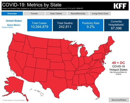 據美國約翰斯·霍普金斯大學最新統計數據,截至北京時間11月16日5時30分,美國新冠肺炎累計確診病例達到11000984例,在過去的24小時新增141323例。在不到一週時間內,美國新冠肺炎累計確診病例從1000萬例暴增至1100萬例,創下了新冠疫情發生以來的最快紀錄。 11月13日,長期跟蹤美國新冠疫情的凱斯家庭基金會在網站上公佈了最新的疫情地圖,除了遠在太平洋的夏威夷州之外,全美49個州及華盛頓特區全部成為紅色的疫情熱點地區,可以説美國已經“整體淪陷”。