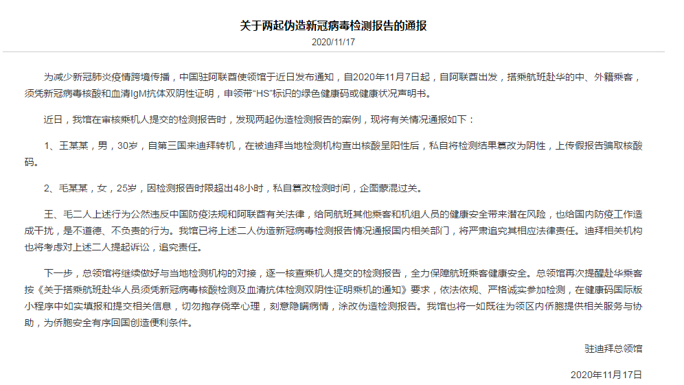 2人偽造新冠檢測報告,中國駐迪拜總領館:嚴肅追究法律責任