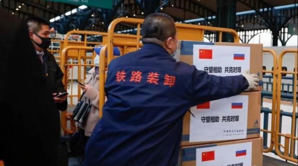 用中文和俄語寫着“病毒必將被擊敗,勝利屬於我們!”標語的醫療物資多次從中國運往俄羅斯。