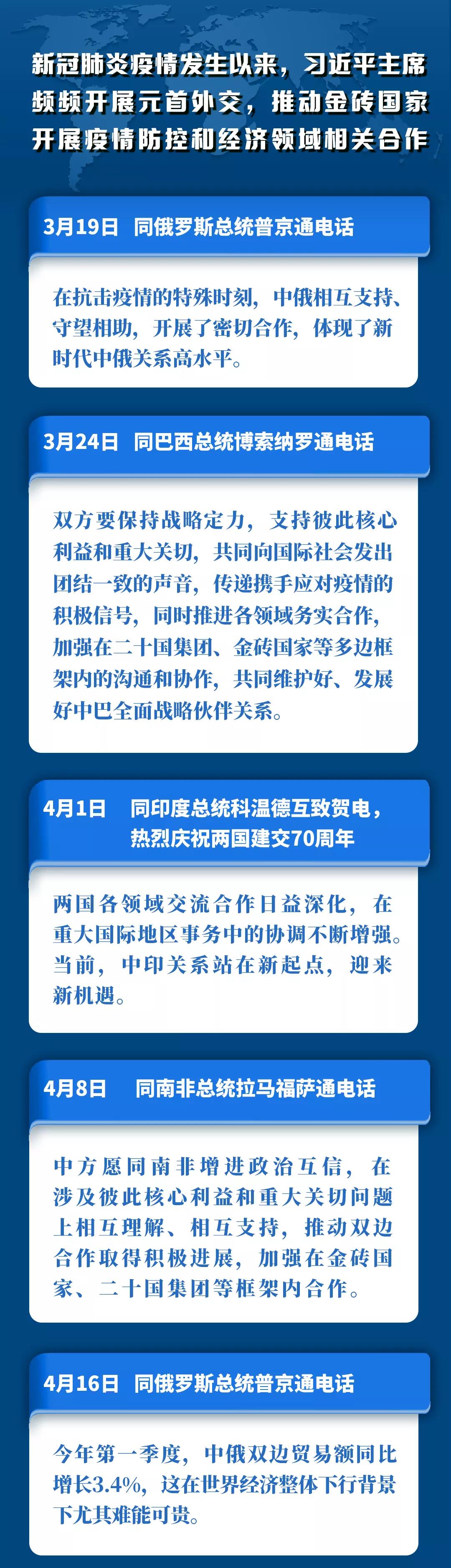 ——4月28日,金磚國家應對新冠肺炎疫情特別外長視頻會議呼籲攜手抗疫,強調密切疫情信息分享和經驗交流,開展藥物和疫苗研發合作。