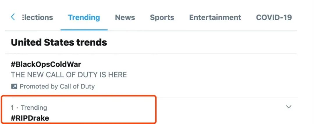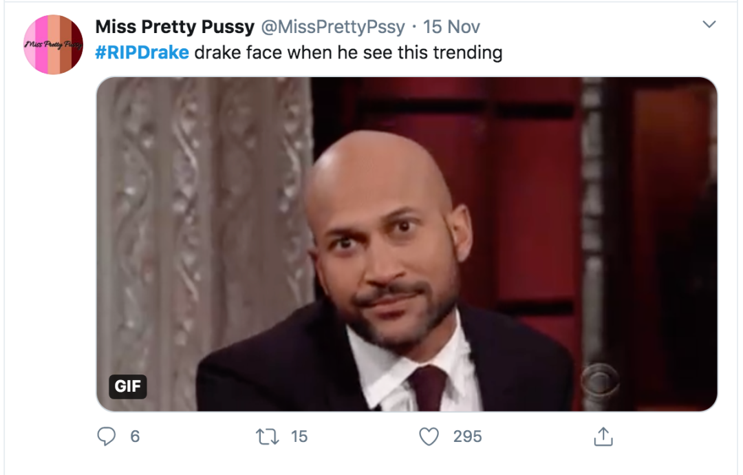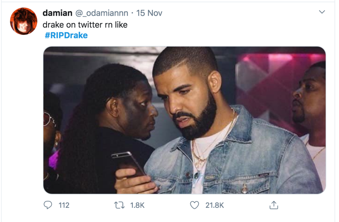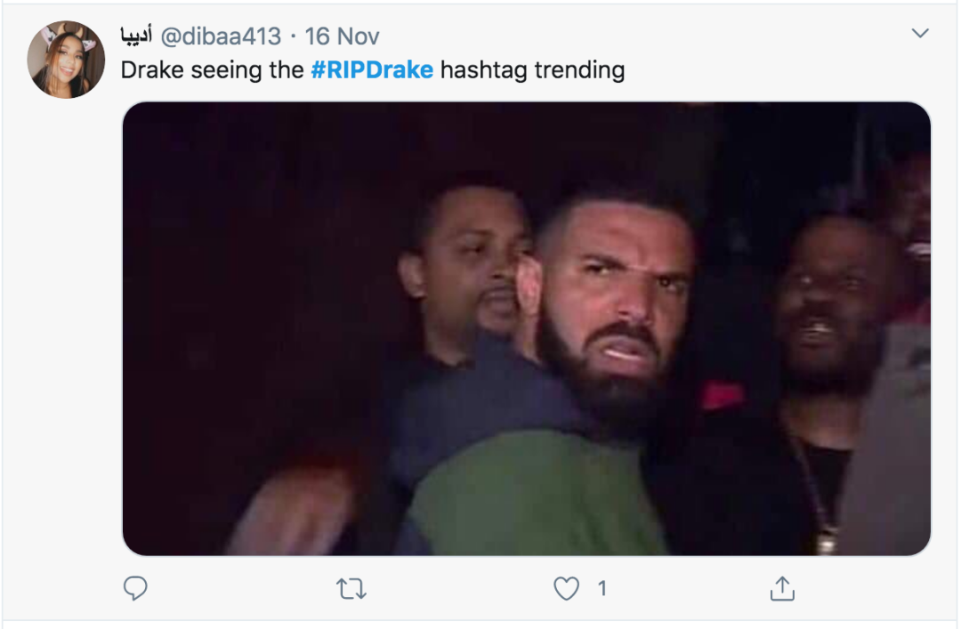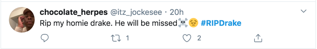 一個名為#RIPDrake(安息吧Drake)的標籤突然上了推特趨勢第一名。