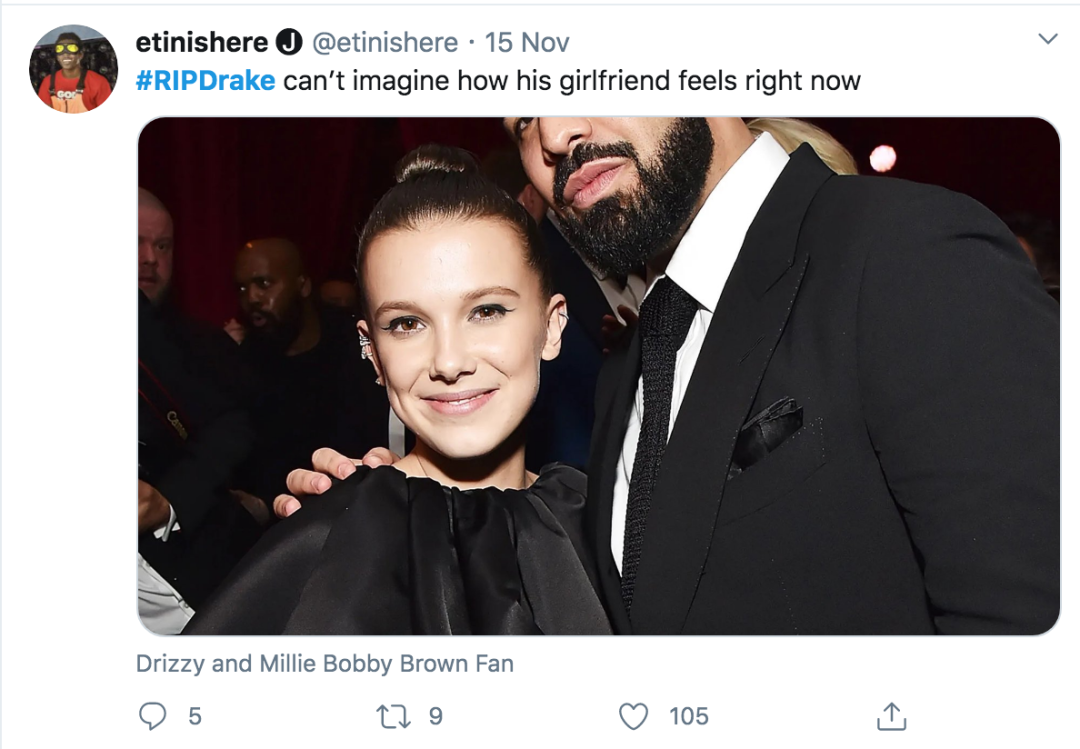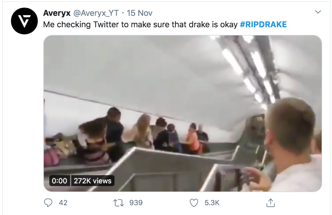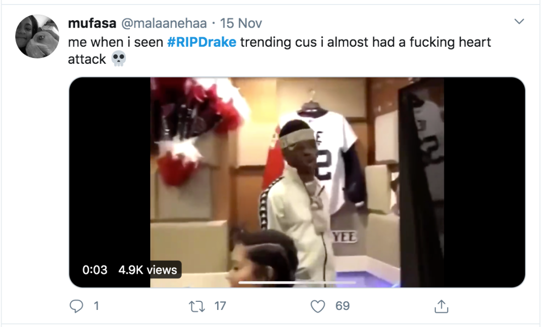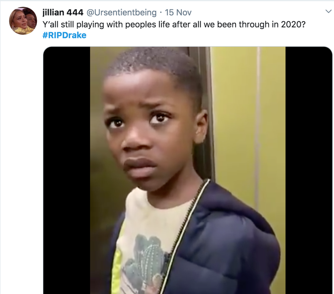 一個名為#RIPDrake(安息吧Drake)的標籤突然上了推特趨勢第一名。