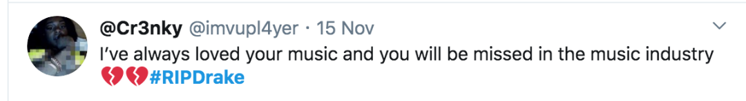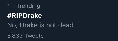 此外,為了證實Drake沒有死,推特還把“不,Drake沒死”的標語加在了#RIPDrake這一標籤的下面。