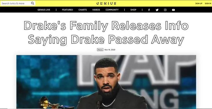 第二張圖是Genius的報道,説Drake的家人證實了他的死亡消息。