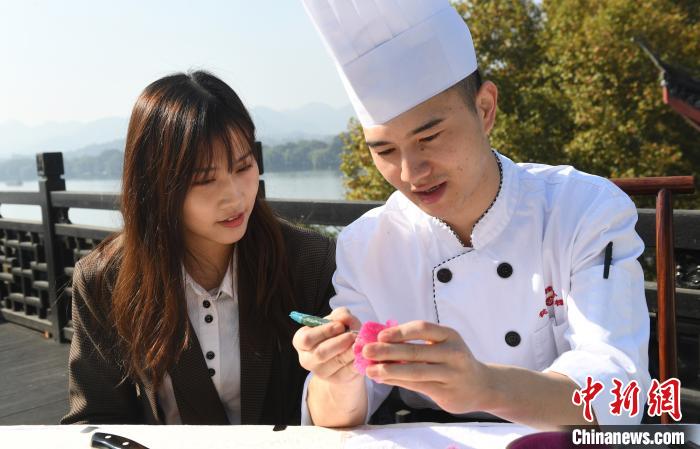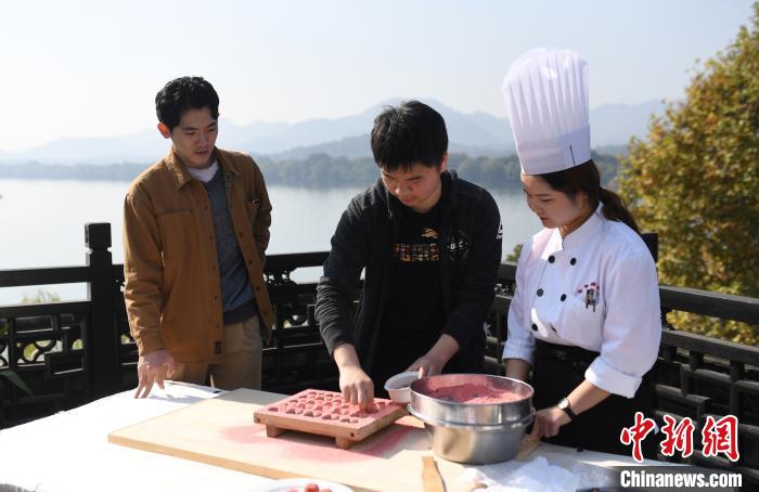 11月11日,“浙台青年文化聯誼行——走進百年老店樓外樓”活動在浙江杭州舉行。現場,來自台灣的青年們學習製作了杭州名菜西湖醋魚,特色糕點定勝糕,嘗試了傳統雕花技藝,還了解了美食背後的故事,加深了對杭州的瞭解。