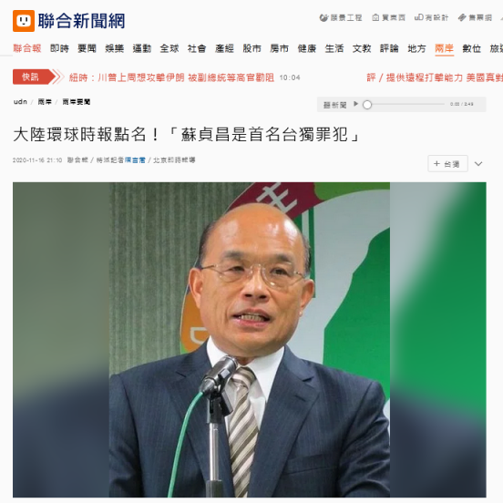 《環球時報》17日社評提到,島內蘇貞昌之流的惡劣“台獨”表現早已世人皆知,他們近期“修憲謀獨”的策略在島內外被廣泛識破。制定清單,就是對這些“台獨”頑固分子及其金主等主要支持者的嚴正警告。