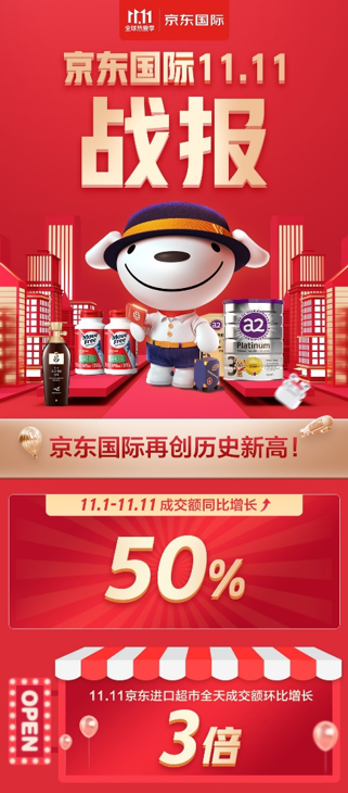 【環球網科技綜合報道】據京東方面透露,11月1日-11月11日,京東國際成交額同比增長50%,而11月11日當天10分鐘內成交額同比增長超120%,京東進口超市全天成交額環比增長3倍。
