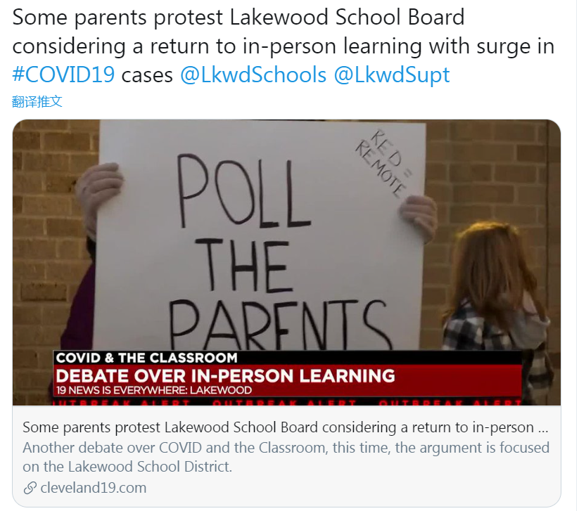 當地時間11月16日晚間,美國俄亥俄州萊克伍德高中門口聚集了大量的學生和家長,他們舉着“諮詢家長意見”、“堅持遠程授課”和“不要謀殺教師”等標語,抗議學校在當地疫情持續擴散的情況下,堅持重啓面對面授課的計劃。而同一天在美國新澤西州亞特蘭大市,超過200名教職工集體罷工,以抗議學校在重啓的同時,缺乏相應的新冠病毒防控措施。這些教師表示,校方沒能兑現此前有關翻修學校通風系統的承諾,甚至還用地毯烘乾機來冒充空氣淨化器。