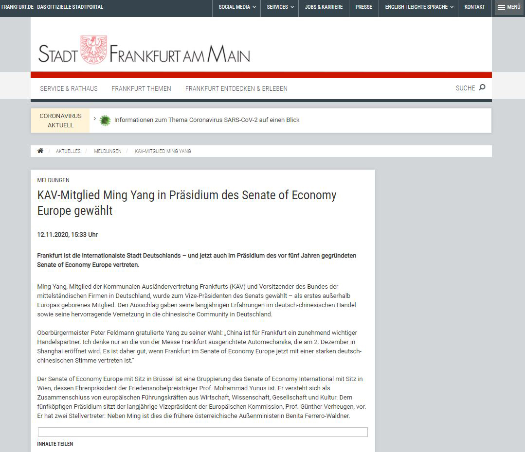 ▲圖為法蘭克福市政府官網發佈祝賀楊明議員選任歐洲經濟參議院副主席。